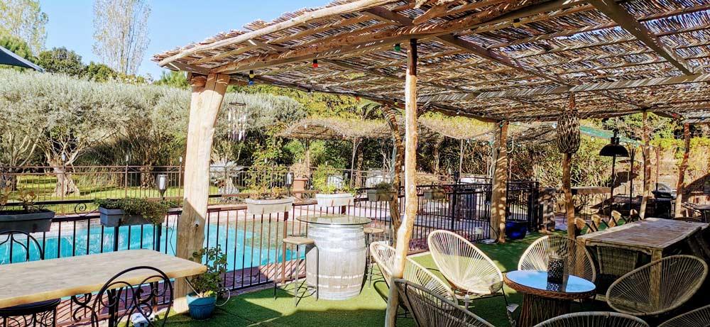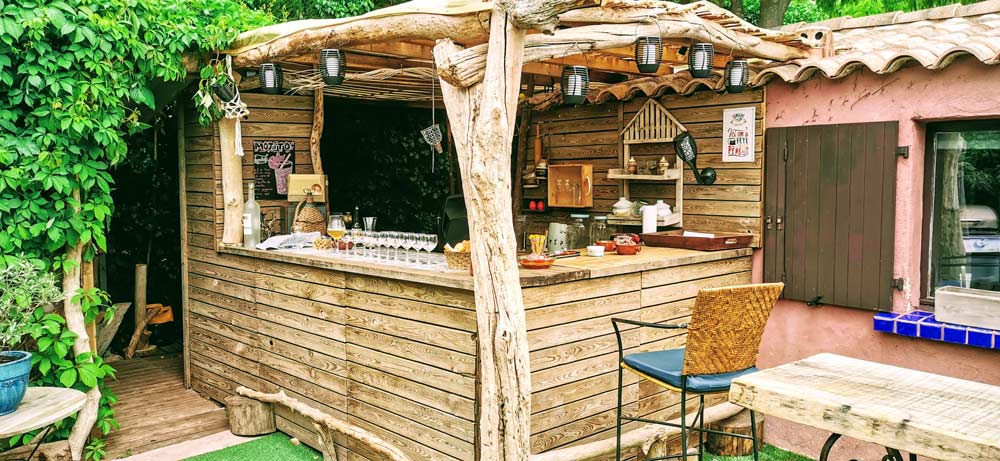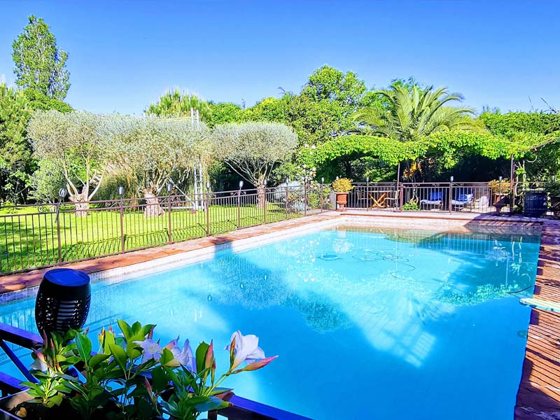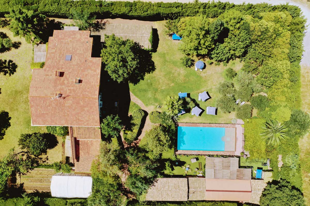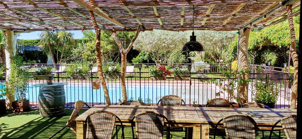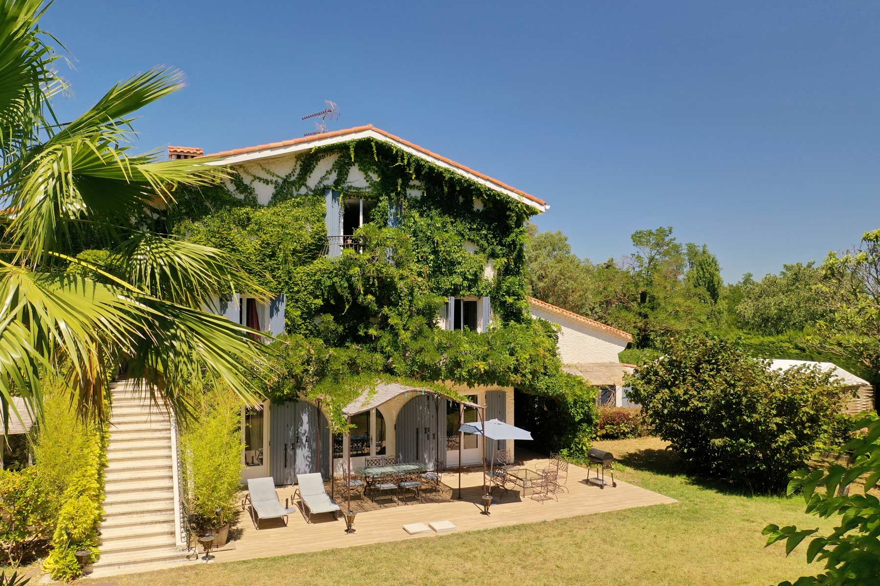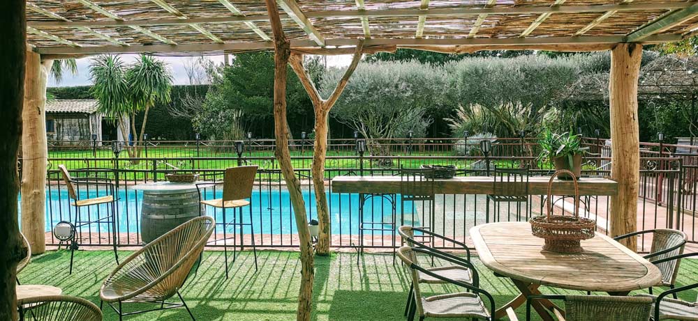 Profitez d’un hectare de terrain avec un parking sécurisé, une grande piscine de 15m x 6m entourée de transats, une tonnelle végétalisée, et une paillote en bois flotté pour se détendre.