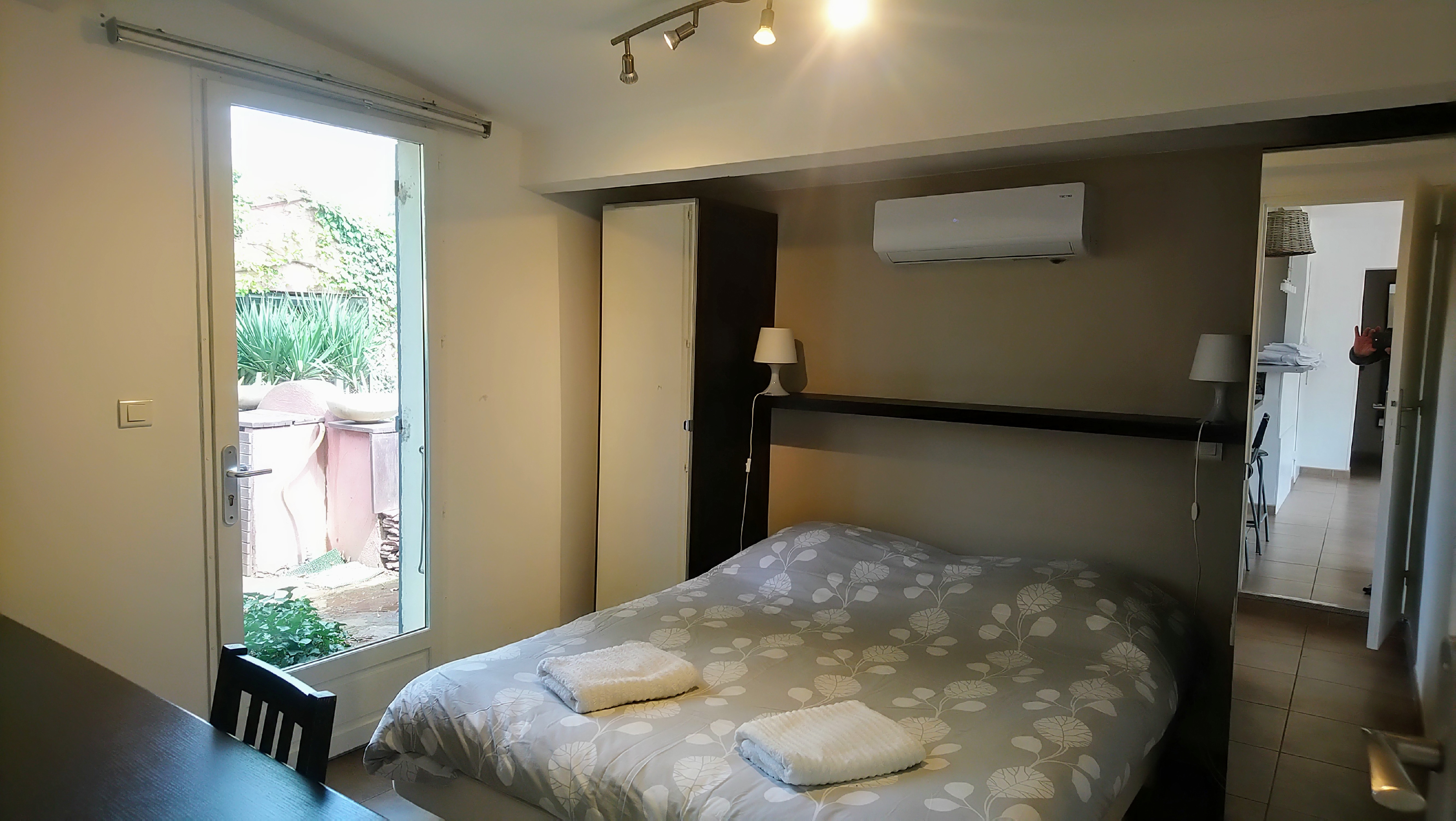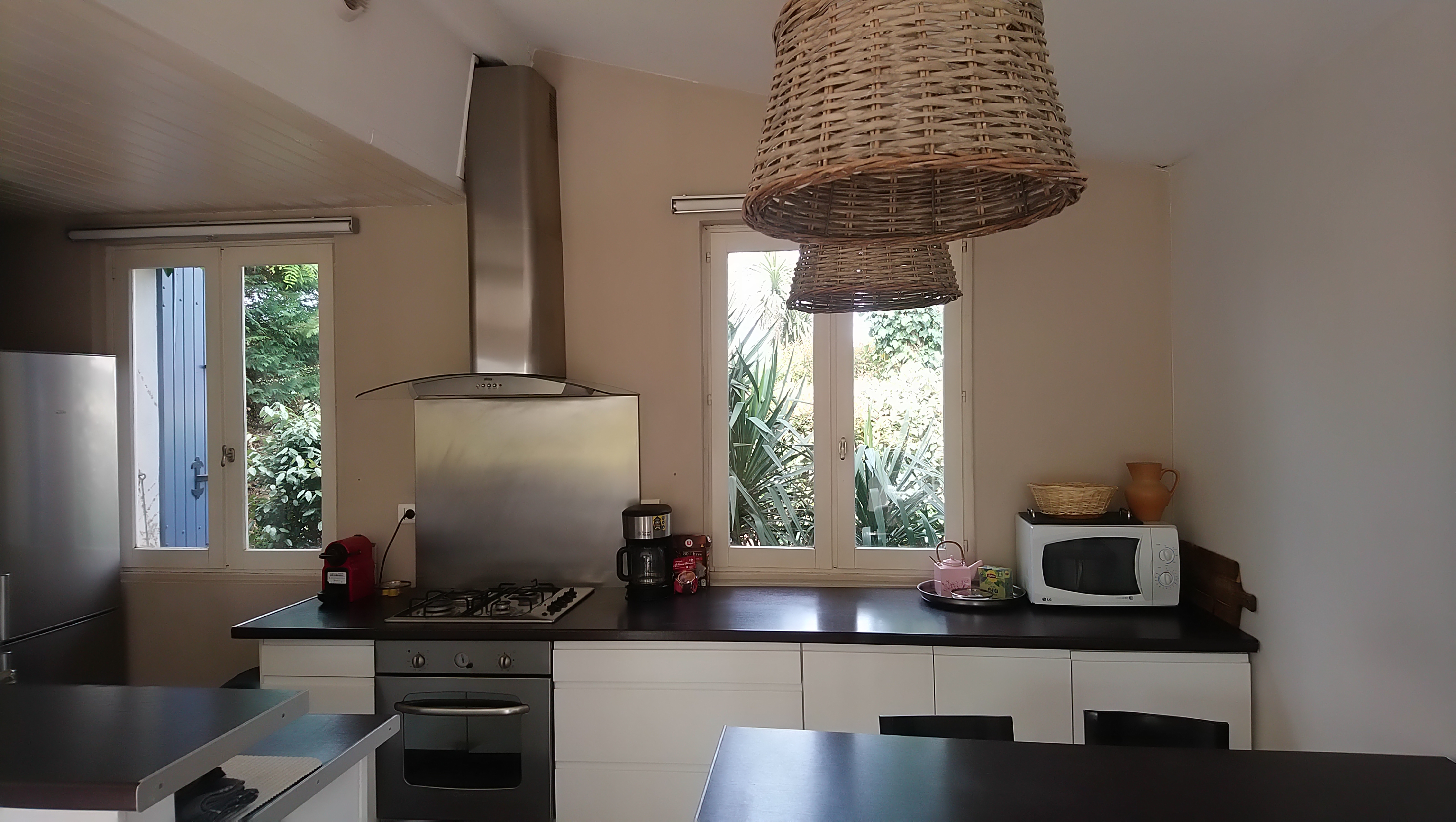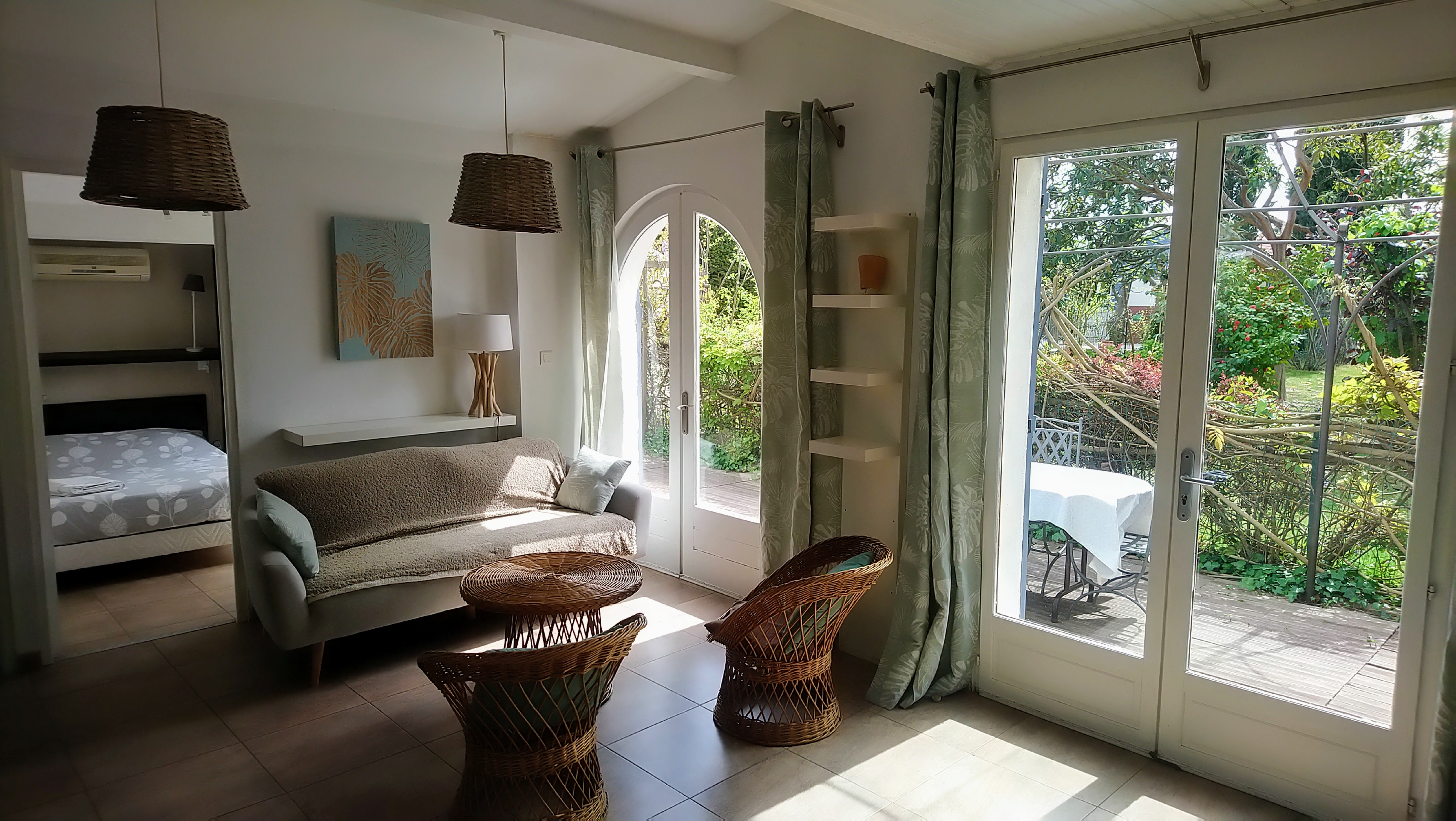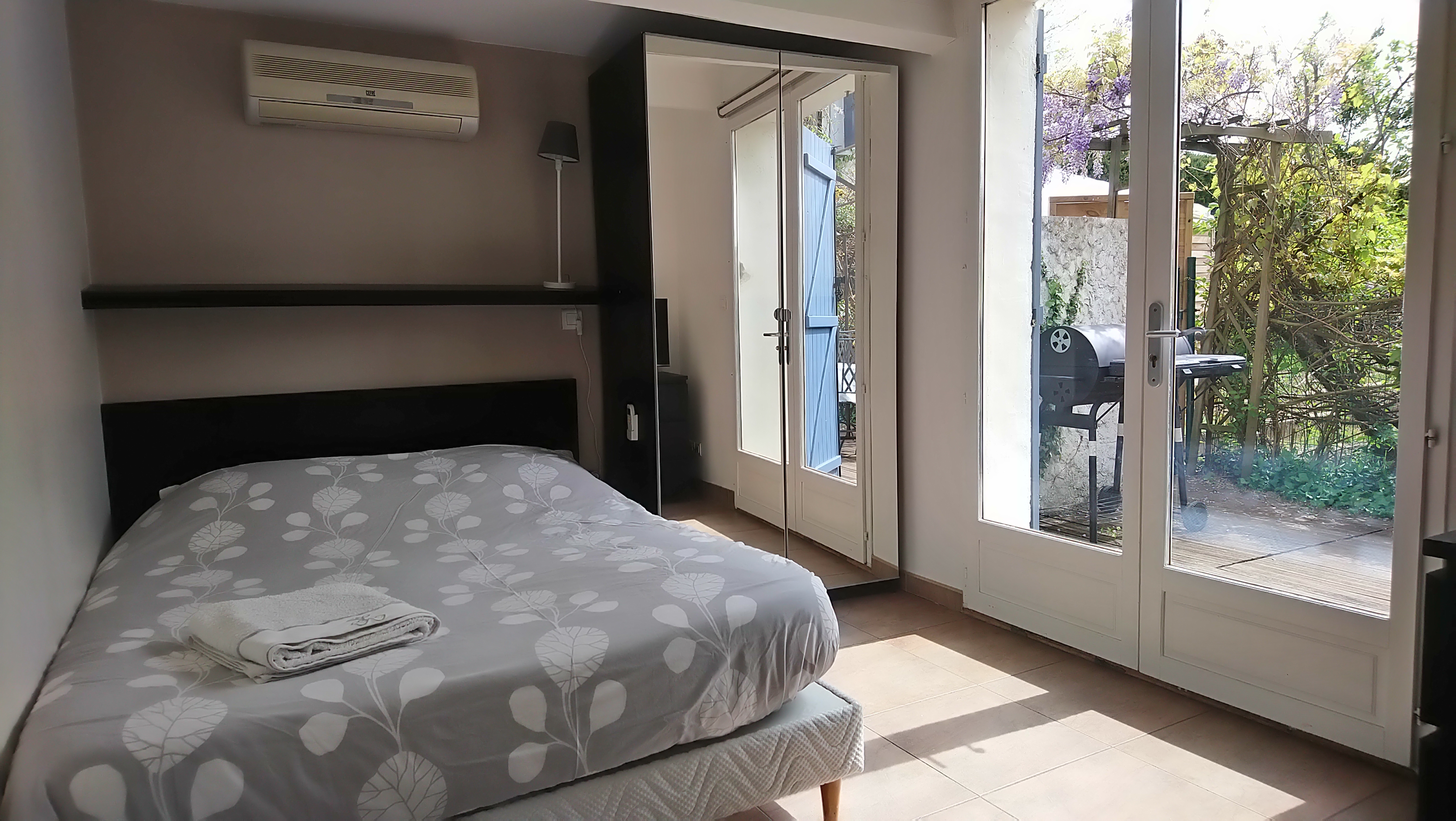 Il y a 3 chambres climatisées, 2 de plein pied et une à l’étage avec vue sur le jardin, la piscine sécurisée de 15m/6m est à 20m