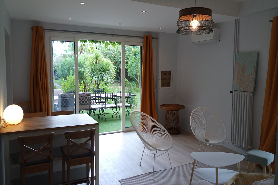 2 chambres et salon climatisés, 3 terrasses, wifi, vue sur jardin et piscine.